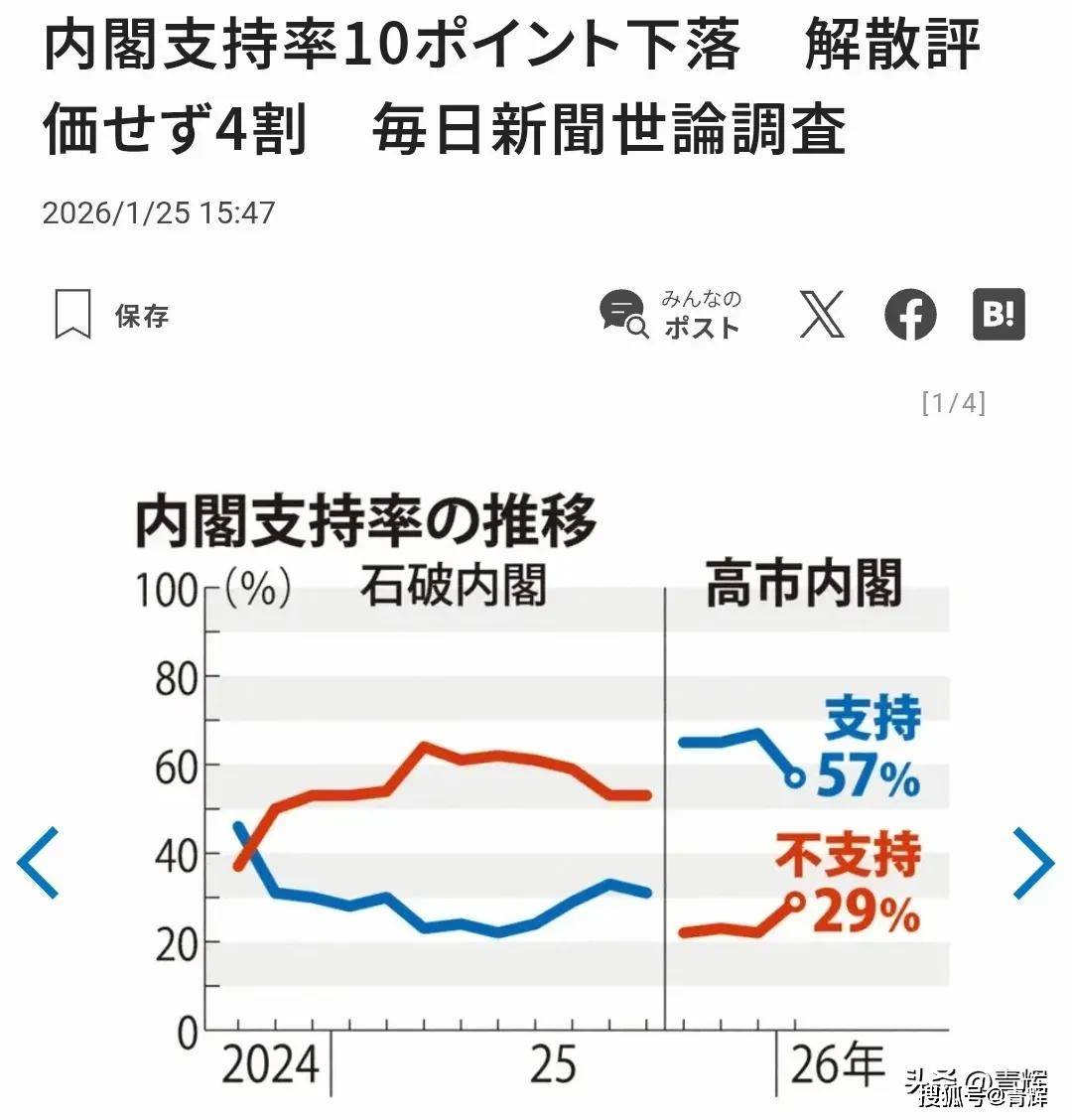 其实按照之前的民调数据显示可以得知,高市早苗的内阁支持率已经大幅度下跌。从去年12月份高达70%以上的支持率已经掉回了57%,当时外界分析民调下滑的主要原因是高市早苗解散众议院,导致的选举混乱和选举成本的增加引发了一些民众的不满。