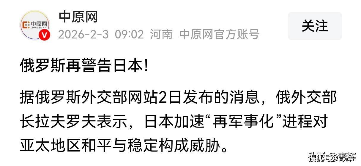 而除了我国坚决反对日本的这个势头之外,还有俄罗斯。二月二号当天,俄罗斯外长拉夫罗夫明确的向日本发出了警告。